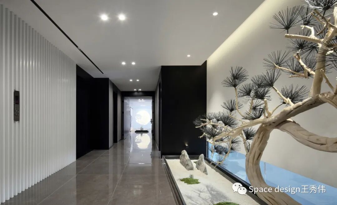 入户加入枯山水的设计,枯山水是日本园林的一种,由中国汉代传入日本,但也是日本画的一种形式。 以沙代水,以石代山,往往是一组或者若干组石景,白沙或者绿苔铺地,或配置少量的乔灌木,石景的平面布局大体上按照直线与三角形相综合的规律.立体构成则以三石一组为基本单元。无论石景的总体或者局部的石组.,都具有明确的主客之势、韵律之感的构图美。