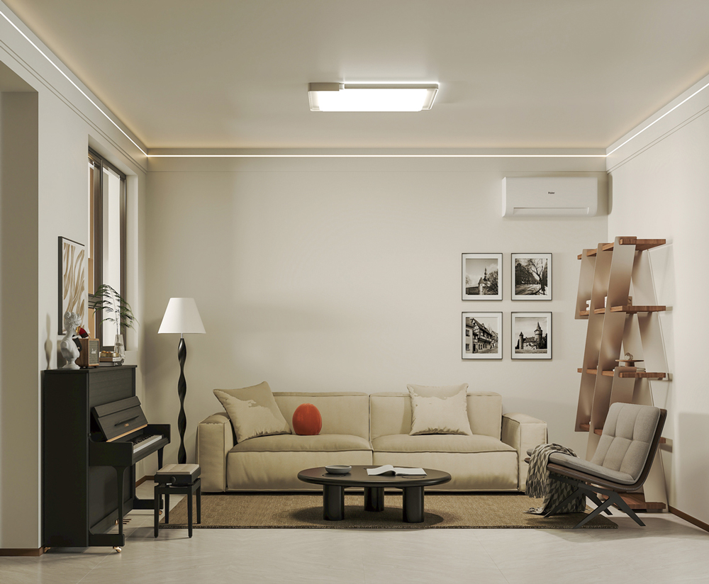 开放式布局,浅米色沙发、黑色圆形茶几形成视觉焦点,装饰画、几何置物架丰富层次,线性灯带 与吸顶灯柔化空间,钢琴增添艺术感。
