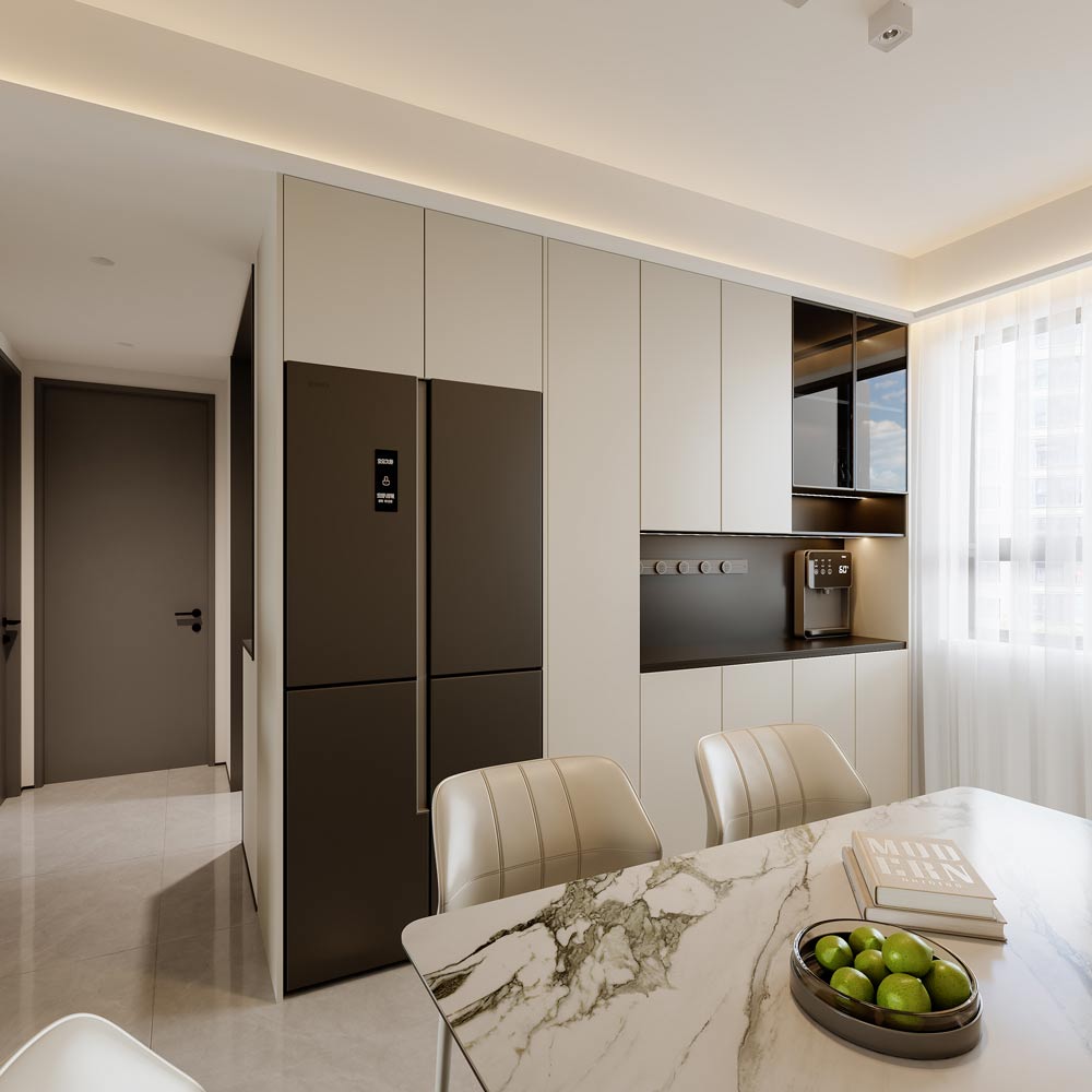 ▲客餐厅一体化 客厅与餐厅采用开放式布局,利用浅灰色大尺寸地砖和无主灯设计,最大化地延伸了空间感, 使公共区域显得开阔通透。客厅作为家庭核心区,以浅色系皮质沙发和艺术感茶几为中心,搭配柔和的线性 灯光,营造出放松的社交氛围;餐厅则以大理石餐桌和简约餐椅为主体,背景墙的艺术挂画成为视觉焦点, 提升了空间的艺术格调。