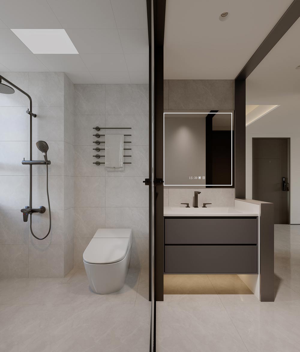 ▲卫生间精细化 采用干湿分离设计,浅灰色瓷砖与深灰色浴室柜形成对比,智能马桶和电热毛巾架等细节 配置,体现了对居住者生活品质的关怀。