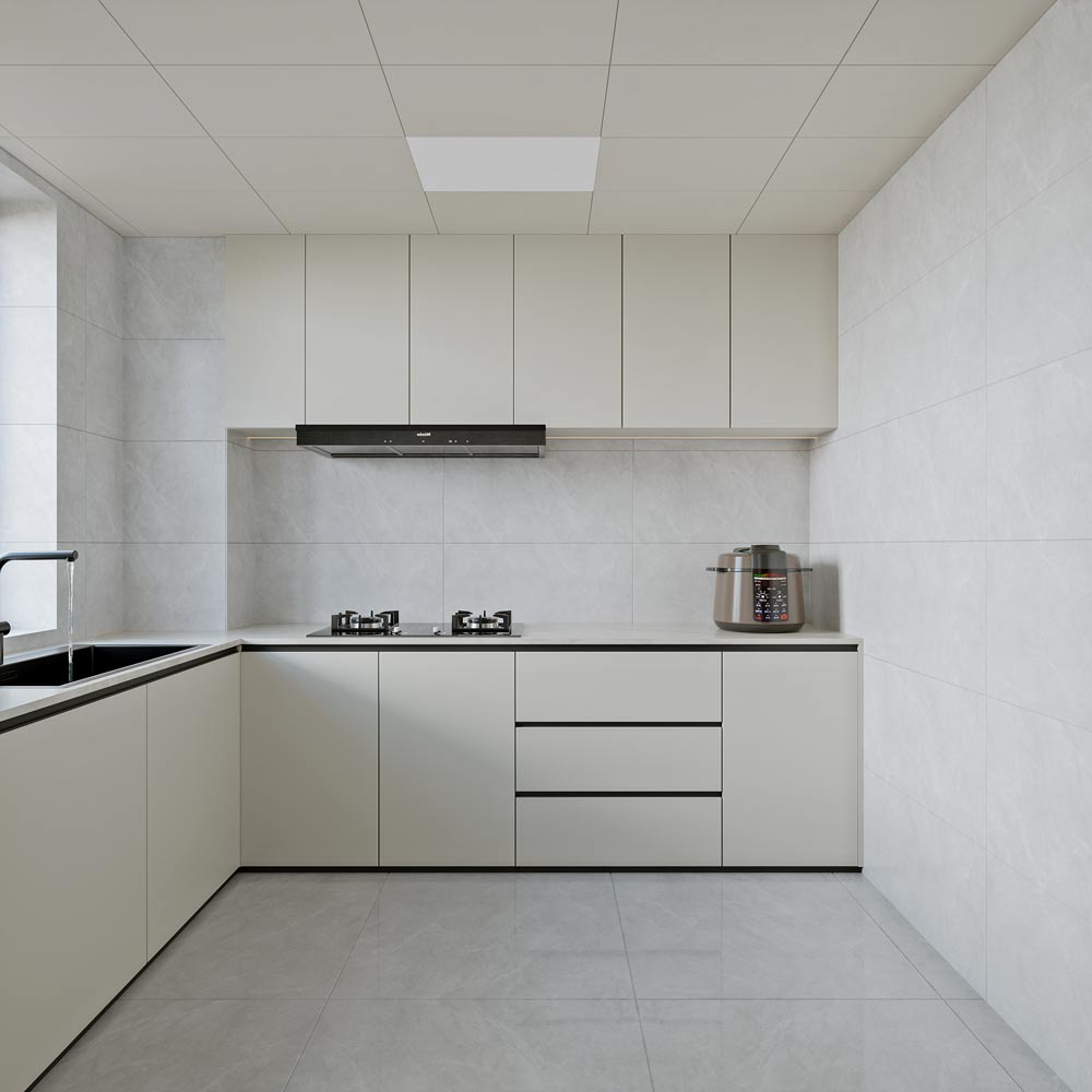 ▲厨房高效化 采用 L 型橱柜布局,浅米色柜门与墙面瓷砖和谐统一,嵌入式电器与台面一体化设计, 既保证了操作动线的流畅,又实现了空间的整洁有序,提升了烹饪效率。